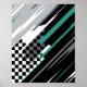 A dynamic abstract design combining sharp diagonal streaks and a black-and-white checkered pattern. The composition features bold diagonal lines in black, white, grey, and teal shades cutting across the image, creating a sense of speed and motion. The upper section transitions into a checkered pattern, reminiscent of racing flags, blending geometric precision with energetic movement. The mix of contrasting colors and shapes gives the artwork a modern, fast-paced aesthetic.