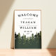 Bienvenue dans votre mariage rustique, boisé ou montagnard avec notre affiche Tall Pines, avec une bordure inférieure de pins à feuillage persistant dans des tons riches de vert chasseur. Ajoutez vos noms, votre date de mariage et le texte d'accueil personnalisé en utilisant les champs fournis.