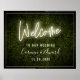 signe de bienvenue mariage avec un panneau d'accueil néo blanc avec arrière - plan boxwood et texte blanc.