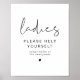 Cette enseigne de toilette pour dames mariage est dotée d'une police manuscrite pointue et d'un design minimaliste simple. La combinaison simple de couleurs noir et blanc en fait un complément parfait à tout événement. Utilisez ce poster pour votre réception de mariage, douche nuptiale, douche à couple, etc.
