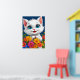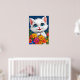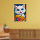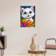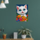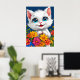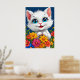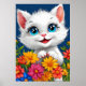 Adorable chat de dessin animé à la fourrure blanche moelleuse et grands yeux bleus expressifs. Le chat est en train d'observer un bouquet animé de fleurs colorées, dont des fleurs orange, rose, jaune et bleue. Son petit nez rose et son sourire joyeux ajoutent à son charme, créant une atmosphère ludique et accueillante. L'arrière - plan est d'un bleu profond, rehaussant la luminosité des fleurs et des traits du chat, ce qui fait que la scène dans son ensemble se sent vivante et joyeuse.