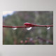 Fresh raindrops cling to a slender red branch, suspended against a soft, blurred background. The simple composition highlights texture, light, and the quiet detail of a moment after rain.