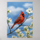 Un cardinal rouge vif du nord est assis sur la branche d'un bois de chien, entouré de fleurs blanches délicates. Le ciel bleu offre un merveilleux contraste à cette image, et l'apparence de la peinture à l'huile ajoute une touche supplémentaire à cette image frappante.