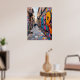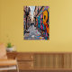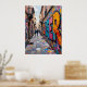 Ce tableau représente une ruelle urbaine étroite avec des graffitis colorés et texturés qui recouvrent les murs des bâtiments. L'oeuvre a une texture d'impasto lourde, avec des coups de pinceau épais et expressifs qui donnent à l'art de rue une qualité relevée et tactile. Deux figures descendent la ruelle, et le sol est jonché de plaques de peinture colorées, ajoutant à l'atmosphère dynamique et énergique de la scène. La composition globale est une représentation vivante et audacieuse d'un paysage urbain moderne.