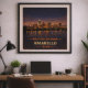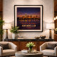 Capturez l'horizon étendu et les lumières de la ville scintillantes du Panhandle texan avec cette affiche du centenaire d'Amarillo. Commémorant le 100e anniversaire de la route 66, cette œuvre d'art d'inspiration vintage présente l'horizon d'Amarillo se reflétant sur l'eau sous un vaste ciel nocturne étoilé. Le design allie la chaleur dorée du soleil couchant à des tons indigo profonds, célébrant l'esprit rude et l'importance historique de cette étape majeure sur la Mother Road.