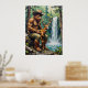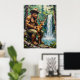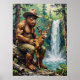 Cette oeuvre d'art chaleureuse présente Bigfoot, une grande créature poilue portant un casquette et un pantalon de cow-boy, qui caresse doucement un jeune faon de cerfs. Ils sont assis sur un rond de mousse près d'une cascade qui coule dans une forêt verdoyante. La lumière du soleil filtre à travers les arbres, créant de la lumière appliquée sur la scène. Les coups de pinceau épais et texturés de la peinture donnent un caractère fantaisiste et tendre à cette amitié inattendue dans le désert.