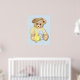 Conception adorable de nurserie avec un ourson en peluche mignon portant un Tam. Un poussin jaune dansant et des amis lapins jouets bleus sont à proximité. Fond à carreaux bleu pastel. Serait un ajout doux à une nurserie.