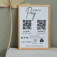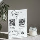 Dans un style minimaliste moderne, un simple scan d'affaires blanc personnalisé pour payer avec le code QR panneau de piédestal. Le modèle adaptable est facilement personnalisable avec des codes QR, du texte personnalisé, des icônes de paiement et des icônes de médias sociaux.