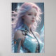 Un androïde futuriste féminin aux cheveux pastel fluides regarde doucement dans le loin, exsudant une présence sereine et éthérée. Son armure métallique se marie harmonieusement aux éléments organiques, créant une fusion harmonieuse de technologie et d'humanité.