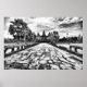 Photo en noir et blanc de l'antique Angkor Wat, vue depuis la promenade. Personne dans cette photo, juste le temple intemporel. Lieu : Angkor Vat, Cambodge. Copyright © Kate McKenna. Tous droits réservés. Illégal à utiliser ou dupliquer sans autorisation.