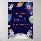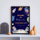 Design décoré sur le thème de l'espace extra-atmosphérique avec une aquarelle avec des fusées, des planètes, des étoiles et de mignons animaux astronautes boisés un raton laveur et un ours ce design cosmique ajoute une touche ludique et imaginative à votre célébration.
