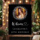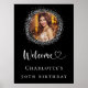 Une affiche de bienvenue pour une fête d'anniversaire glamour de 30e (ou de n'importe quel âge). Un arrière - plan noir classique décoré d'un cadre photo de parties scintillant en faux argent. Personnalisez et ajoutez une photo et un nom. Bienvenue avec un coeur.