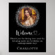 Une affiche de bienvenue pour un événement marquant. Un arrière - plan noir classique décoré d'un cadre photo de parties scintillant en faux argent. Personnalisez et ajoutez une photo, un texte de bienvenue, un nom. Bienvenue avec un coeur.