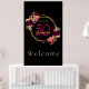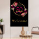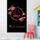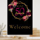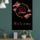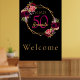 Pour une fête d'anniversaire de 50e (ou tout âge). Un arrière - plan noir chic avec un cadre géométrique en faux or. Décoré de fleurs violettes foncées et bordeaux, de plumes roses et boho. Personnalisez et ajoutez un nom, un âge et une date. Date de naissance ou date de la fête. Le nom est écrit avec un script de style manuscrit, des lettres de couleur rose, l'âge de 50 ans en violet et la date avec des chiffres d'or. Texte : Bienvenue