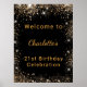 Une affiche de bienvenue pour une fête d'anniversaire de 21e anniversaire (ou de tout âge), fillette et glamour. Un élégant arrière - plan noir décoré avec de la poussière de parties scintillant en faux or. Personnalisez et ajoutez un nom et un âge. Lettres d'or. Retour : aucune conception