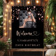 Une affiche de bienvenue pour une soirée glamour de 50ème (ou tout âge) anniversaire. Un arrière - plan noir classique décoré d'étoiles dorées roses. Personnalisez et ajoutez une photo et un nom. Bienvenue avec un coeur.