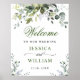 Bienvenue invités à votre mariage avec Watercolor Eucalyptus Greenery Poster de bienvenue Mariage, avec une verdure botanique d'aquarelle luxuriante et des fleurs blanches, avec "bienvenue à notre heureux toujours après", vos noms, et date mariage dans un mélange chic de bloc moderne et de caractères de calligraphie lettré à la main.