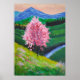Un paysage printanier vibrant avec un arbre rose en fleurs, des collines verdoyantes et des montagnes bleues lointaines — peint en acryliques expressifs avec une texture et une couleur riches.
