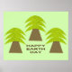 Cette affiche présente une image graphique de trois arbres qui ressemblent à des palmiers avec de grandes frondes vertes et un tronc d'arbre brun robuste. Il y a un message en texte marron pour ressembler à du sol sous les arbres. Le message dit Happy Jour des terres.