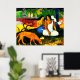 In the imaginary scene in the background, there are several women worshipping a statue. Gauguin has enlarged a small Maori statue to the size of a great Buddha, and has invented a sacred rite.