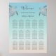Deux élégantes tortues de mer argentées sur un arrière - plan abstrait en dégradé de style plage. Poster de la liste des sièges de mariage avec un texte de bienvenue, vos noms de mariée et de mariée dans un élégant script et des champs de texte pour 100 invités.