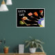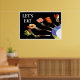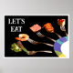 Cette affiche culinaire moderne a été créée à partir de l'une de mes photographies originales. Elle présente un étalage artistique de mets succulents équilibrés sur des fourchettes en argent Oneida, émergeant du bord d'une assiette en porcelaine de chez Mikasa modèle Currents. Le texte en gras « LET'S EAT » en haut à gauche ajoute une touche accueillante et contemporaine.