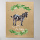 Jolie impression zèbre, parfaitement neutre avec un fond marron kraft, verdure aquarelle, et texte calligraphié blanc.