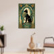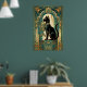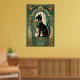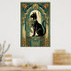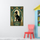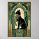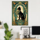 This playful art deco black cat climbs a stylized teal curtain framed by golden motion trails and geometric folds. The dynamic upward composition and rich 1920s color palette create an energetic yet elegant piece perfect for kitchens, hallways and creative spaces where cat lovers appreciate sophisticated design.
