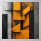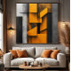 Composition abstraite avec des panneaux géométriques superposés en orange métallisé, noir et gris béton. Des textures industrielles usées créent de la profondeur et un drame visuel. Design architectural moderne idéal pour une décoration contemporaine, des bureaux ou des espaces urbains. Apportez un impact visuel et une sophistication industrielle à votre environnement avec cette pièce artistique unique.