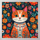 Chat kitty d'art folklorique orange et bleu aux yeux bleus et un art ai arrière - plan floral.