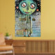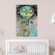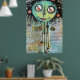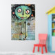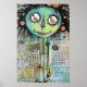Un personnage fantaisiste aux yeux larges et irréguliers et aux cheveux noirs gribouillants domine le premier plan contre un arrière - plan collage rempli de texte et d'éléments abstraits. Des côtelettes d'orange et de rouge sous forme de spirales et de cercles apportent une touche ludique à l'ensemble sombre et éclectique de la pièce.