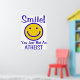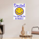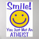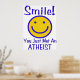 Put a human face on Atheism with a bright yellow face outlined in blue with blue letters that says: "Smile! You just met an ATHEIST."