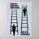 Deux échelles contre un arrière - plan gris clair. Sur la gauche, une échelle avec des barreaux blancs a une silhouette d'une personne qui descend, accompagnée du texte "CHAQUE JOUR COMMENCE PAR DES ATTENTES" au-dessus. Sur la droite, une échelle noire montre la silhouette d'une personne qui monte, avec le texte "FINIT PAR DES EXPÉRIENCES" en dessous.