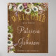 Elégante mariage de automne élégante affiche d'accueil modèle sur bois de grange brun clair comme arrière - plan avec des fleurs d'ivoire et pourpre poussiéreuses, des cordes de lumières chaudes scintillantes et un script de typographie fantaisie en or et crème. +++++++++++++++++++ Personnalisez-le avec vos détails ! Vous pouvez choisir de le customiser en changeant davantage les polices et les couleurs de l'écriture. ++++++++++++++++++ Il convient pour l'été, l'automne ou l'hiver / jardin rustique de campagne / jardin extérieur ou mariages de ferme.