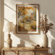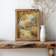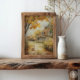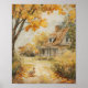 Cette peinture capture une journée d'automne sereine dans une maison de campagne pittoresque nichée au milieu du feuillage d'automne vibrant. Les tons chauds de l'or, de l'orange et de l'ambre créent une atmosphère cosy et accueillante, avec des feuilles qui tombent doucement sur la scène. Un canard se promène tranquillement le long d'un sentier tortueux, apportant une touche de vie charmante au cadre paisible. La maison rustique, avec son bois patiné et son toit incliné, est entourée d'arbres luxuriants et de buissons automnaux, offrant un sanctuaire parfait au coeur de la nature. Cette oeuvre évoque un sentiment de nostalgie et de tranquillité, idéal pour ceux qui apprécient la beauté simple de la vie campagnarde en automne.
