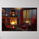 Un coin lecture confortable par jour pluvieux d'automne. Autour du foyer, un feu éclatant, des fauteuils rouges moelleux, des piles de livres, des teacakes et une théière complètent le confort. À l'extérieur, un saule jaune et une haie d'érable et de hêtre rouges sont obscurcis par la pluie qui s'enflamme, qui asperge la fenêtre où un chat gingembre s'assoit en regardant dehors.