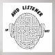 Avid listener text and a maze in the shape of a face with the words in and out at the ears is a humorous puzzle design for birthdays and holidays and teacher toxits.