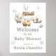 Poster rustique en baby shower avec de jolies vaches de montagne, un rondin enneigé et des flocons de neige. Parfait pour un baby shower d'hiver. Les mots peuvent être changés en fonction de vos propres détails ou exigences