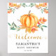 Panneau de bienvenue Baby Shower petite citrouille aquarelle. Présentant une citrouille aquarelle reposant sur un lit de feuilles colorées d'automne et une police "Bienvenue" à paillettes dorées. Personnalisez facilement et rapidement cette charmante petite affiche de bienvenue sur le thème de la citrouille.