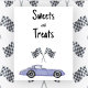 Carte d'invitation baby shower à thème de voiture de course avec des illustrations aquarelles d'une voiture vintage violet (violet) et drapeau noir - blanc. "Course pour un baby shower."
