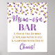 Affiche du bar Momosa pour le baby shower en blanc, violet foncé et motif de confettis or avec lettrage manuscrit. Idéal pour les baby showers et l'aspersion de bébé.