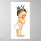 Affiche de baby shower du prince avec un adorable prince brunette portant une couche bébé bleu clair, des chaussons et une couronne argentée. Cette douce affiche de baby shower du prince fait un excellent cadeau ou un ajout à la nurserie de bébé. Vous pouvez ajouter du texte, une couleur de fond et choisir le type de papier ou même la toile.