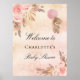 Un poster de bienvenue pour un baby shower élégant et moderne. Arrière - plan rustique rose vif et or rose, gazon à la pampa de style boho, floraux rose or et rose vif, ours en peluche tenant un ballon rose. Personnalisez et ajoutez un nom.