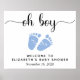 Jolie affiche de bienvenue pour la fête de votre bébé garçon avec "oh boy" dans un joli script avec fioritures et une aquarelle bleu pastel de pieds de bébé. Personnalisez avec votre nom et la date de la fête.