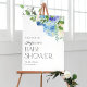 Bienvenue aux invités à votre événement avec ce panneau d'accueil baby shower personnalisable. Il dispose d'un bouquet floral aquarelle de fleurs d'hydrangée bleue, d'ivoire et de roses violets et de verdure. Personnalisez en ajoutant vos détails. Ce panneau de baby shower fleuri est parfait pour les baby showers de printemps et d'hiver.