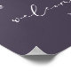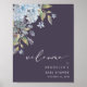 Un poster de bienvenue baby shower avec hydrangées bleu aquarelle et feuilles, avec "bienvenue" en calligraphie moderne sur un arrière - plan bleu marine. Personnalisez avec vos détails et votre cadre.