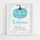 Bienvenue à vos invités dans votre baby shower à thème automne avec ce joli panneau d'accueil citrouille bleu et orange turquoise.