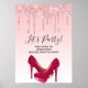 Un design moderne et tendance bacjhelorette sur une affiche. L'arrière - plan a une image brillante, rose, goutte à goutte, (fausse) parties scintillant le long du sommet. Le reste de l'arrière - plan est un délicat dégradé de couleur rose pastel. Une paire de talons roses hauts sous le texte personnalisé.