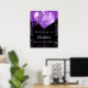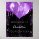 Une affiche de bienvenue pour une Quinceañera, 15e anniversaire, girly et glamour. Un arrière - plan noir décoré de gouttes de parties scintillant couleur violet, look dérapant de peinture, ballons. Personnalisez et ajoutez un nom et un âge. Retour : aucune conception