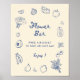 Célébrez l'amour et les nouveaux départs avec notre charmant poster de bar à fleurs pour enterrement de vie de jeune fille "Off The Market", inspiré par le charme et la vibrance d'un marché de producteurs. Ce poster unique à télécharger donne le ton parfait pour une joyeuse réunion, avec des icônes dessinées à la main en bleu représentant des fruits frais, des légumes croquants et de beaux bouquets de fleurs.